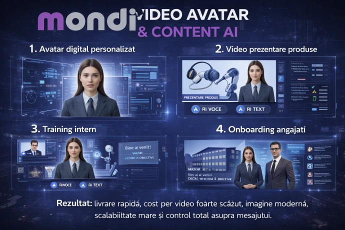 Reprezentare video realistă (voce, limbă, stil propriu). Devine „fața” companiei pentru prezentări, explicații tehnice, suport sau promovare. Consistență totală a mesajului.